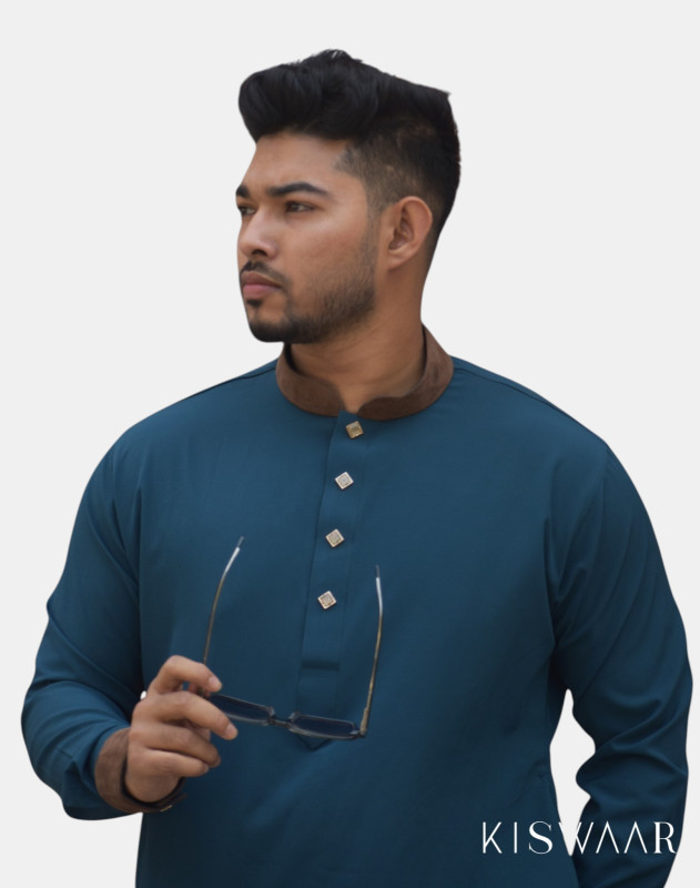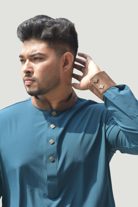 is designed for men who appreciate elegance, comfort, and refined craftsmanship. Made with high-quality Chinese DTEX body fabric, this Panjabi offers a smooth texture, breathable feel, and long-lasting durability. The premium velvet collar and cuff add a luxurious touch, making it perfect for festive and special occasions.